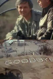 With everyone else now gone, Hawkeye and B.J. are finding information technology all the more difficult to part. As they reminisce over their fourth dimension together, Eagle tries to hold with B.J. that they might come across one another once again, but in case they don't, Hawkeye tells B.J. how much he has meant to him, to which B.J. responds, "I tin't imagine what this place would have been like if I hadn't found you here." The two exchange a long brotherly embrace before Eagle boards a chopper. Right before B.J. leaves on his motorcycle, he shouts to Hawkeye a promise that they volition see each other dorsum habitation, simply he left Hawkeye a annotation just in case. As Hawkeye'due south chopper lifts off, a grin grows on his confront as he finally sees B.J.'south note: the word " Farewell " spelled out in stones on the ground.